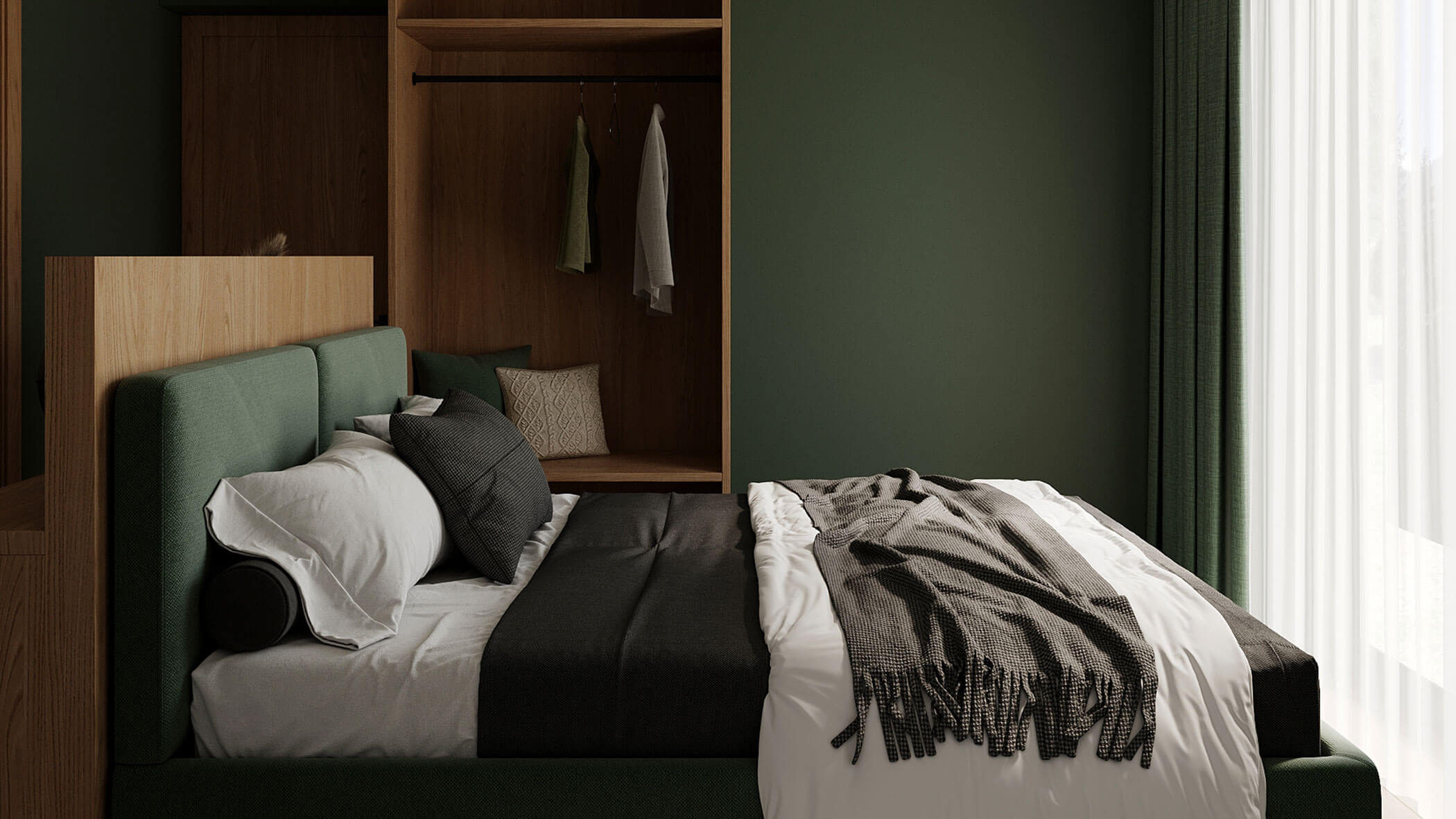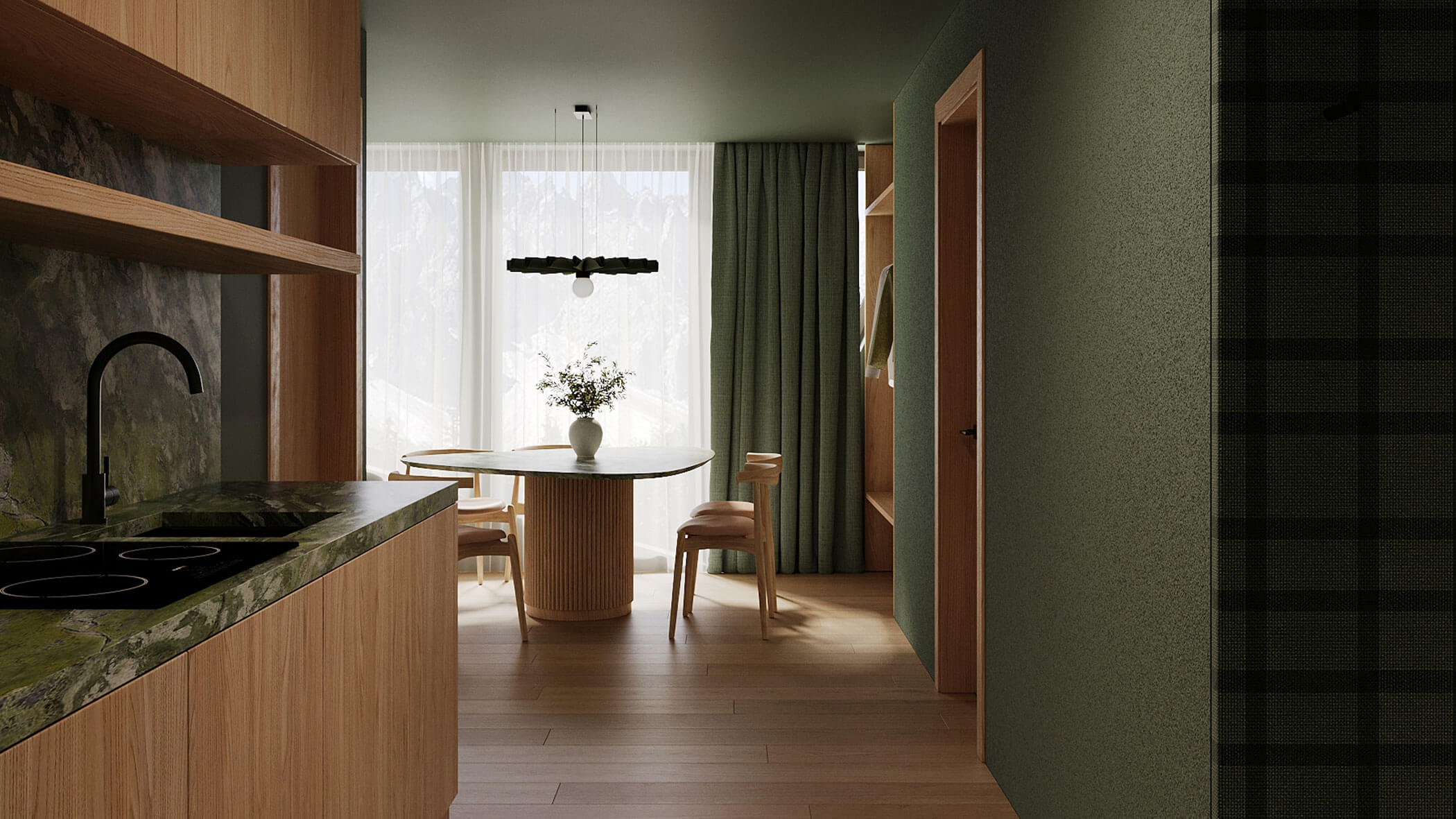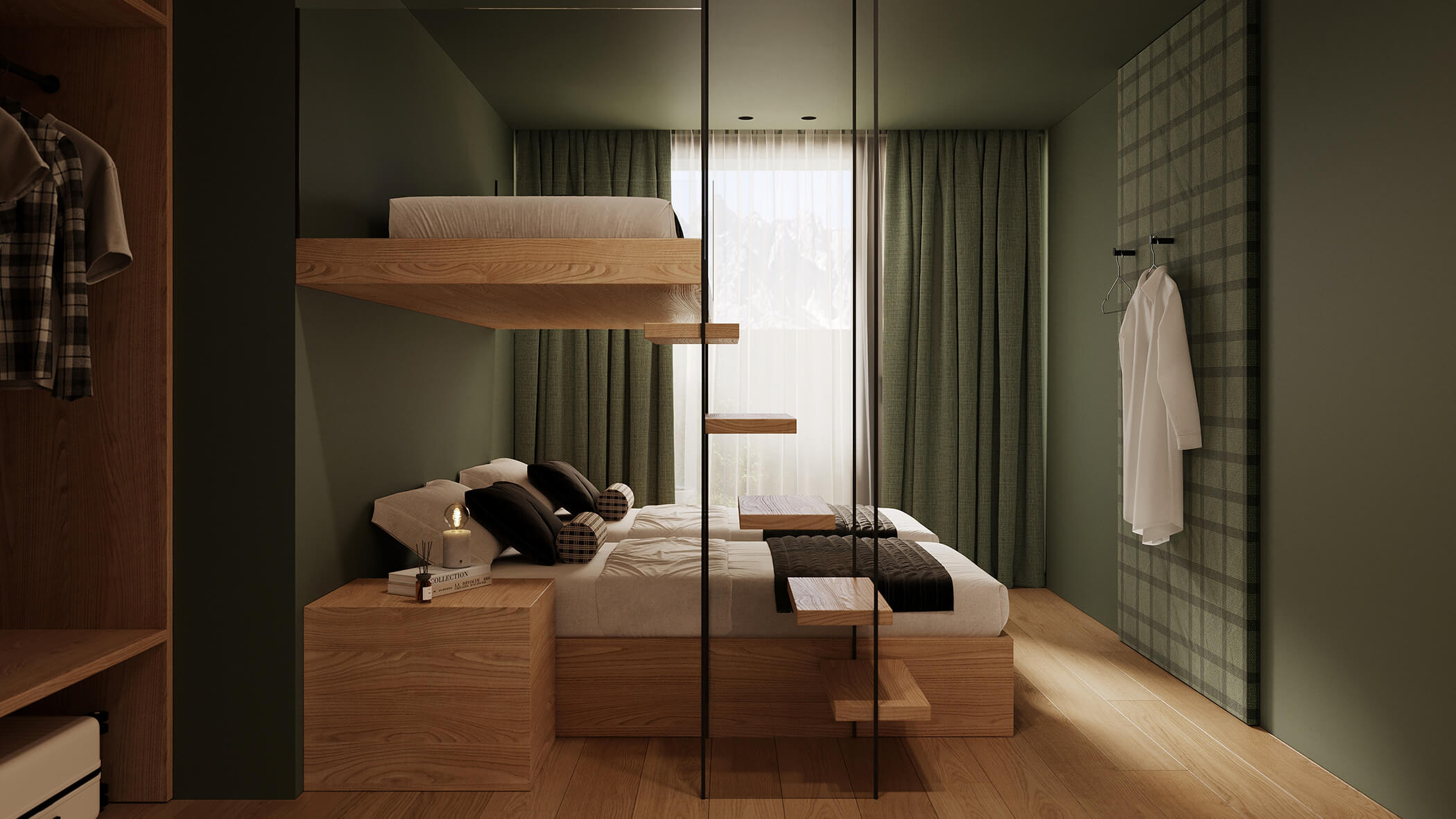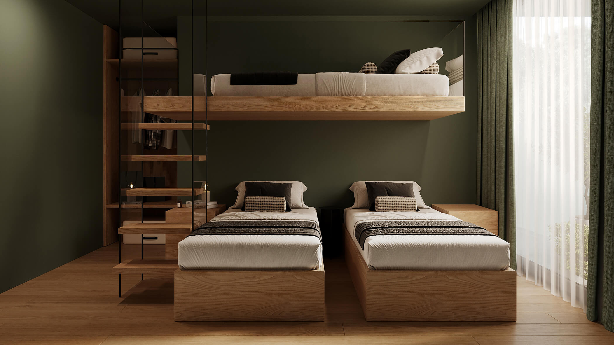 Das Apartment Happiness ist die großzügigste Kategorie – perfekt für Familien. Der helle Wohnraum mit Küche bildet den zentralen Treffpunkt, während zwei getrennte Schlafbereiche Rückzug für Groß und Klein bieten. Ein Doppelbett-Schlafzimmer sowie ein liebevoll gestaltetes Kinderzimmer mit Hochbett und zwei Einzelbetten machen das Apartment besonders familienfreundlich. Zwei moderne Badezimmer mit Dusche und WC sorgen für zusätzlichen Komfort. Eine kleine Loggia verbindet Innen- und Außenraum auf angenehme Weise.