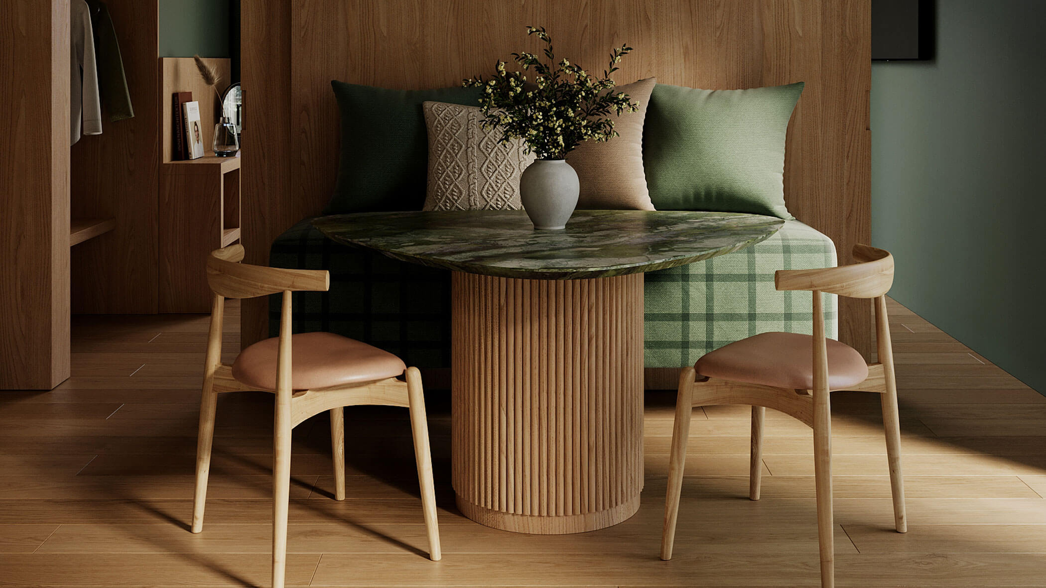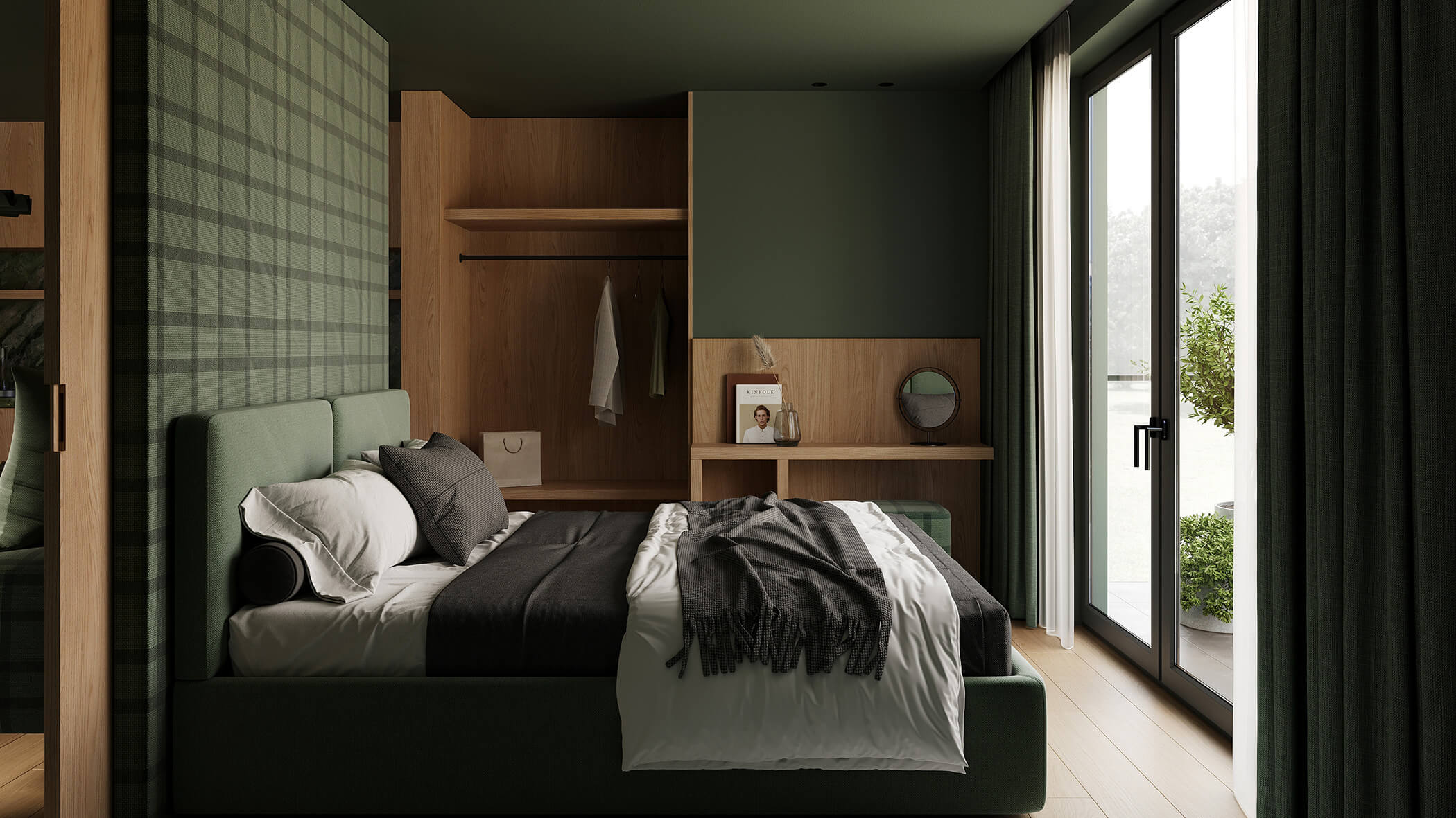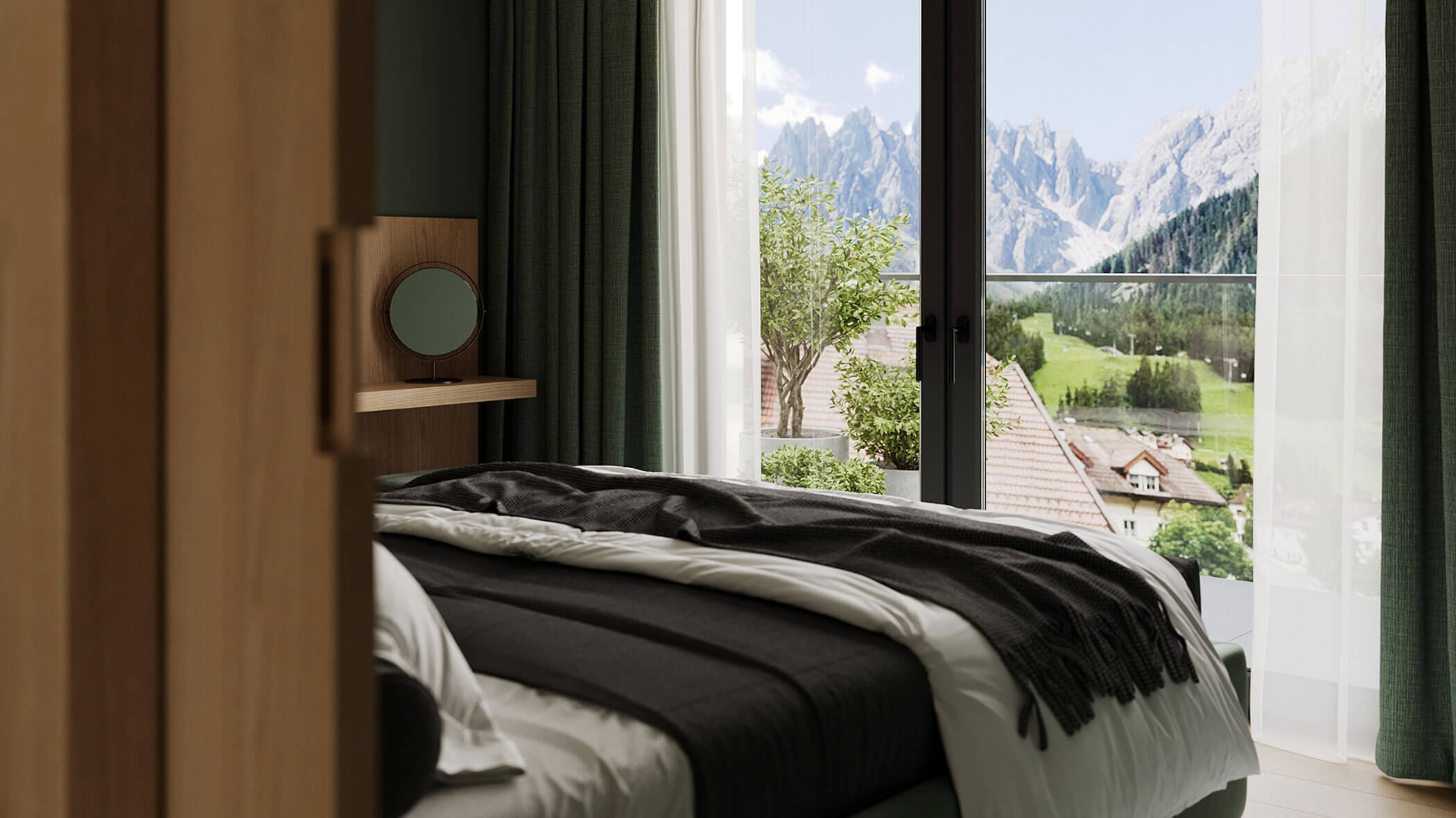Das Apartment Joy mit Südbalkon bietet ein offenes, luftiges Wohngefühl. Der Wohnbereich mit integrierter Küche und gemütlicher Sitzecke lädt zum Entspannen ein, der Schlafbereich ist harmonisch eingebettet oder leicht abgetrennt. Warme Holztöne, hochwertige Stoffe und sanfte Grüntöne schaffen eine ruhige, natürliche Atmosphäre. Der Südbalkon sorgt für sonnige Stunden und zusätzlichen Freiraum.